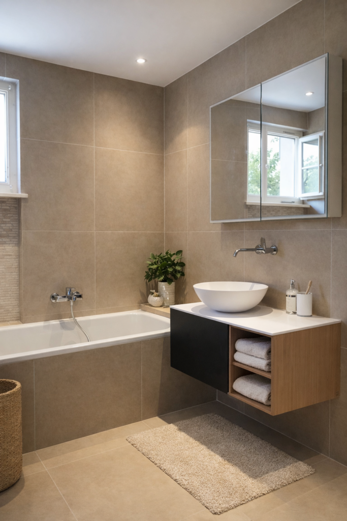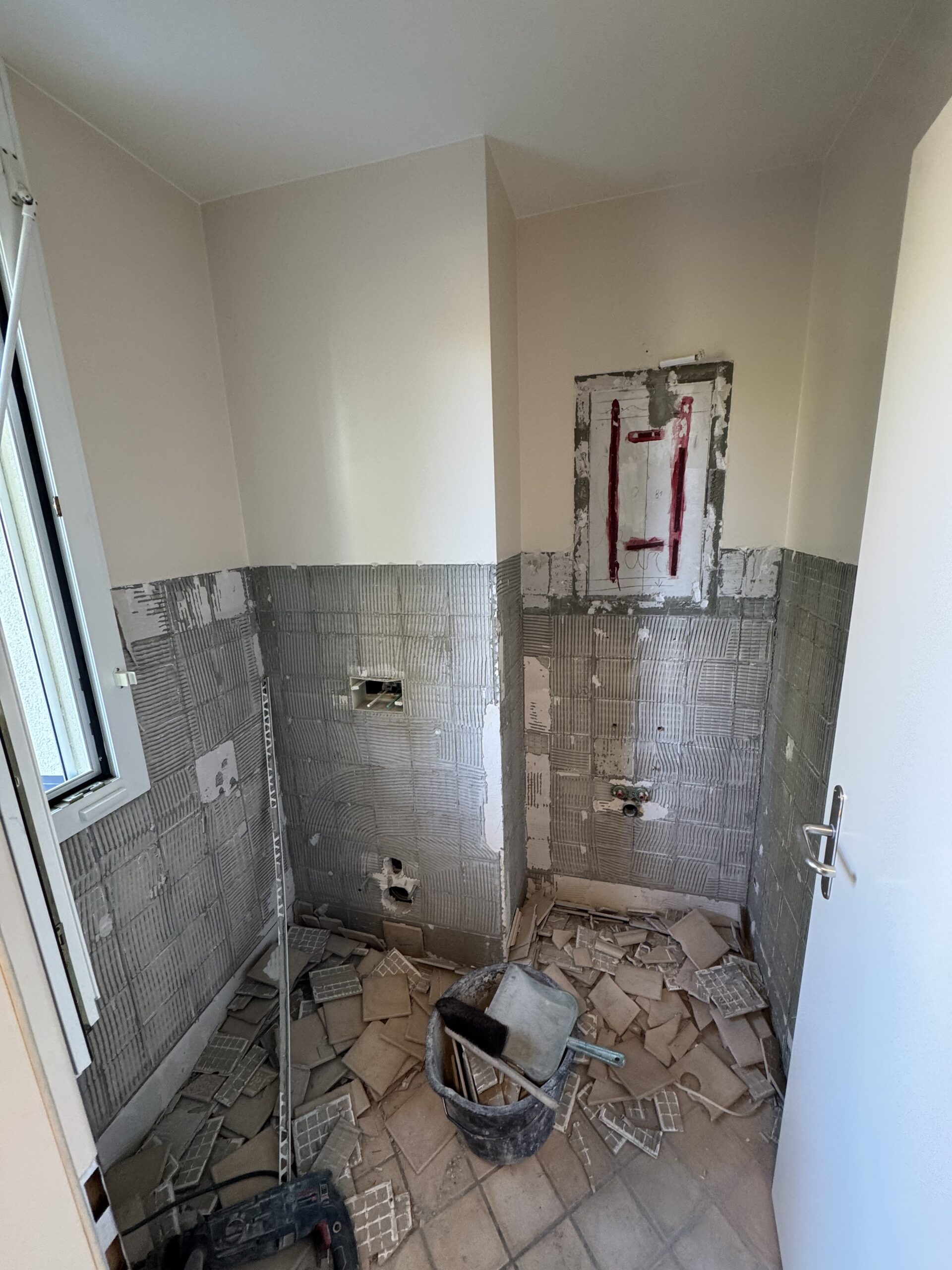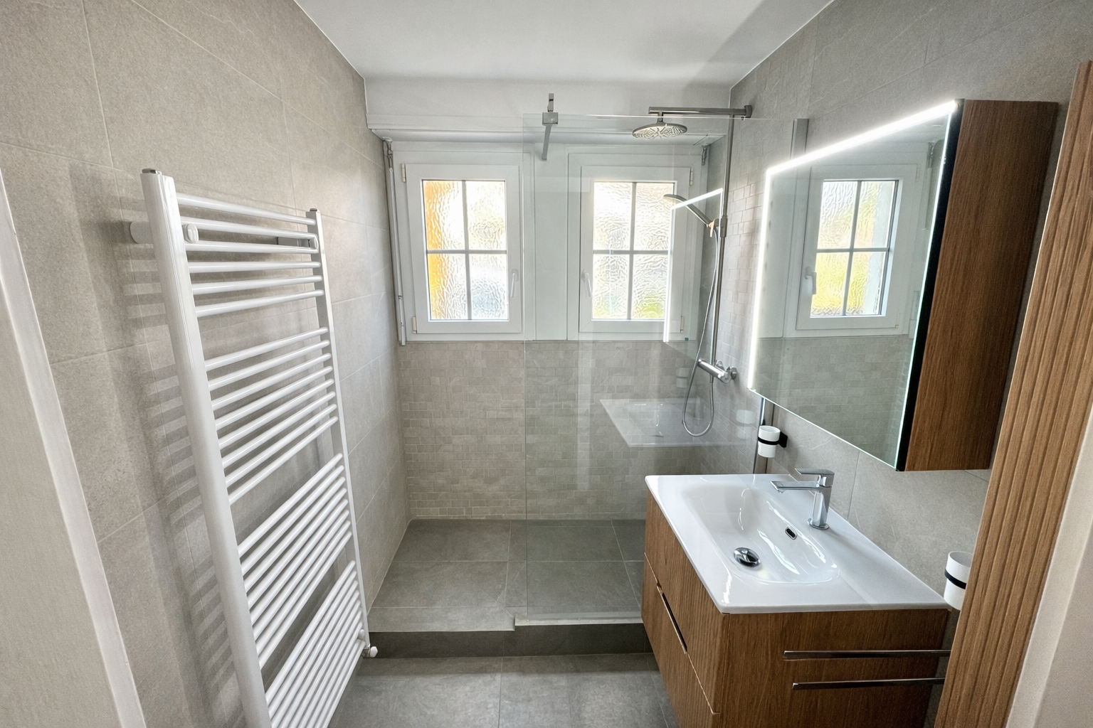 Rénovation complète et sur mesure, remplacement carrelage après dégât des eaux, douche à l’italienne, sanitaires.