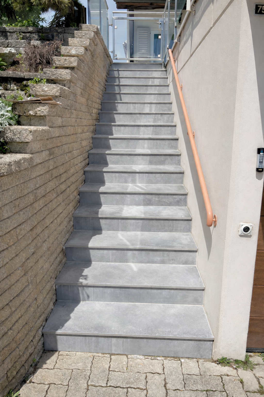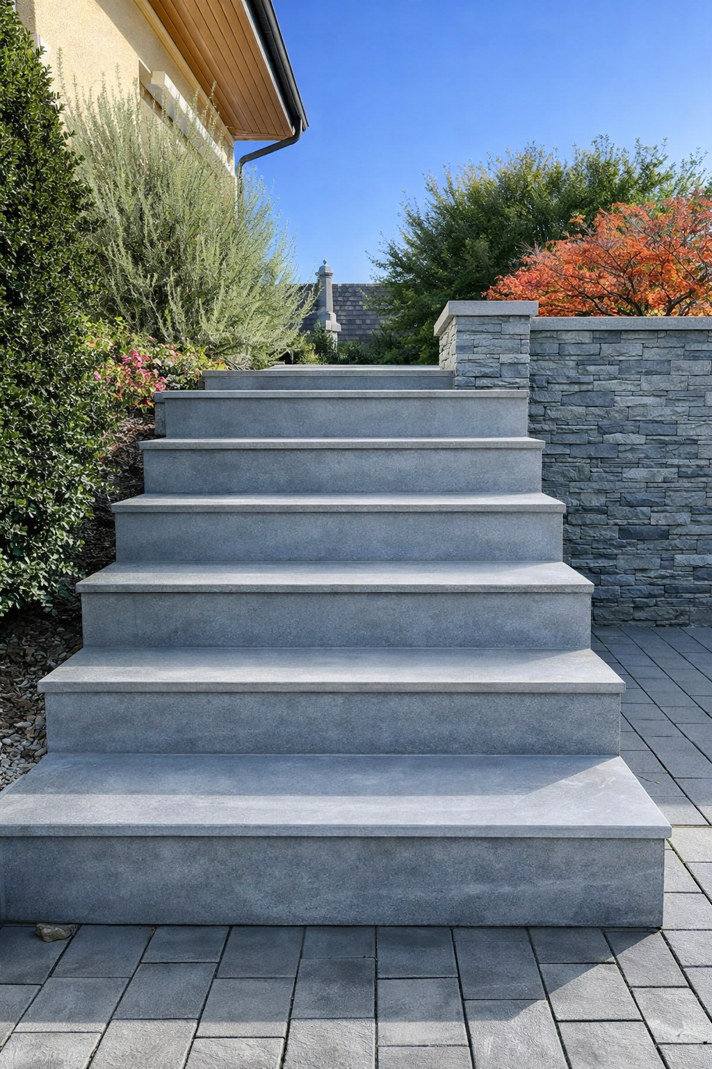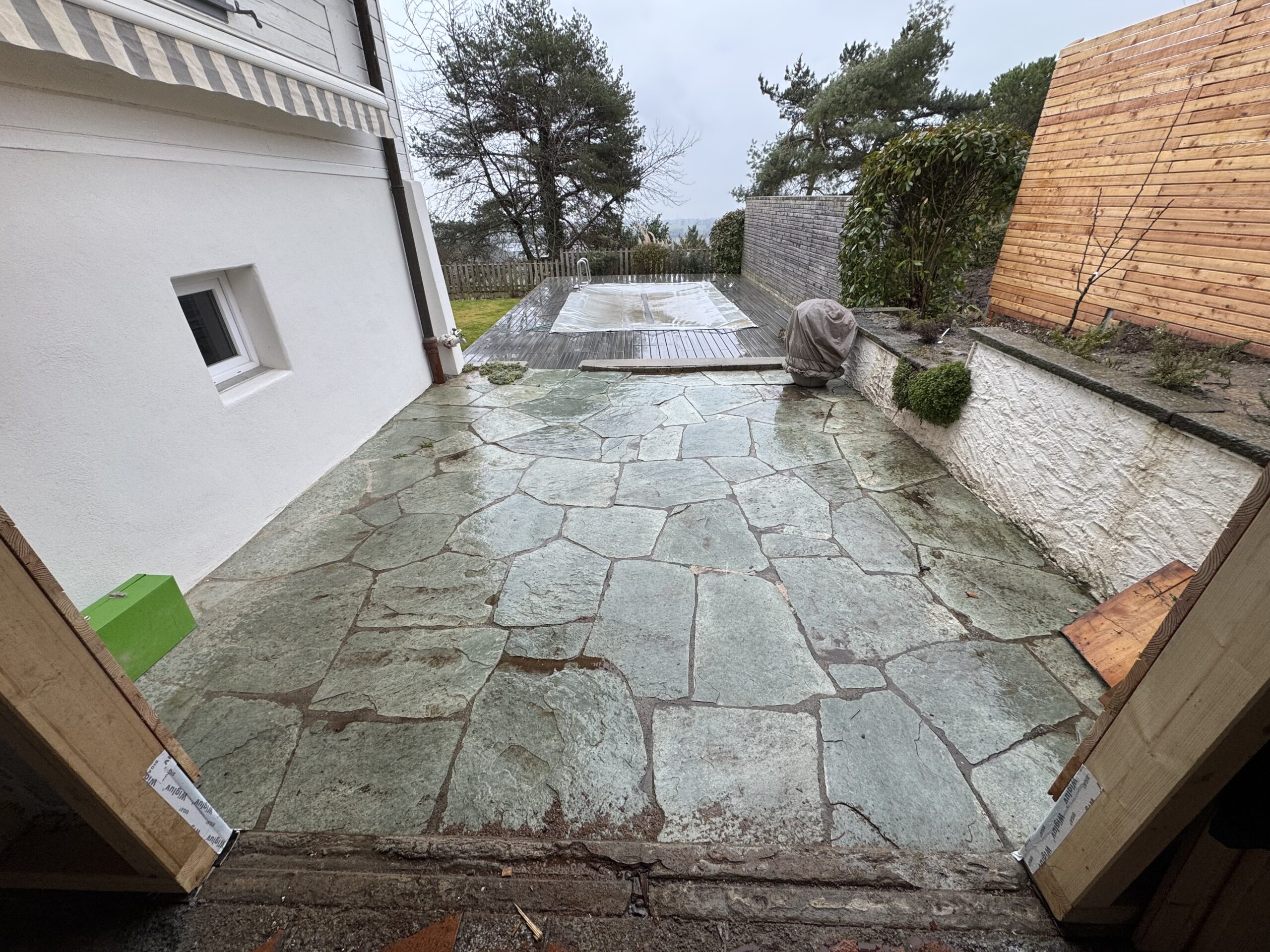 Remise en place de dalles de jardin, chemin d’accès, réalisation de terrasses et escaliers extérieurs.